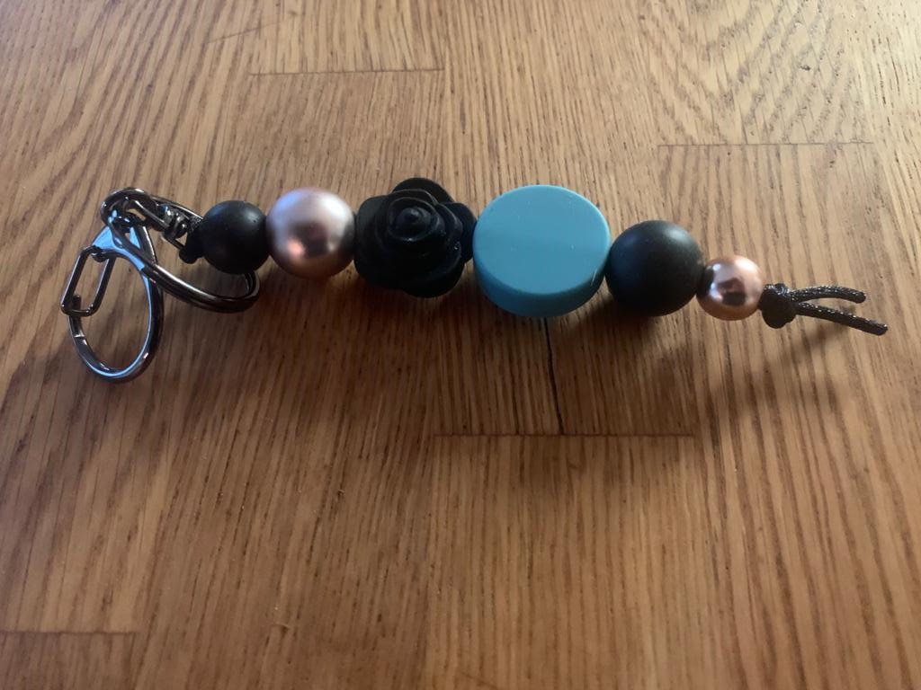 Crafted from food-grade silicone and metallic beads, featuring a sculpted rose and soft teal accent.
